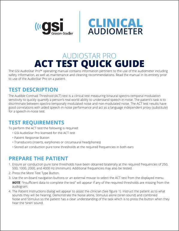 Le test Audible Contrast Threshold, ou ACT™, est un nouveau test disponible sur le GSI AudioStar Pro™ et GSI Pello™*. Le test ACT s’effectue juste en 2 minutes et permet d’évaluer la capacité d’une personne à percevoir la parole dans les environnements bruyants de façon précise. Les résultats du test ACT fournissent des corrélations fiables avec la performance de perception assistée de la parole dans le bruit indépendamment de la langue. Autrement dit, le test ACT peut être effectué sur n’importe quel patient indépendamment de sa langue maternelle. Le test utilise les résultats des tests audiométriques du patient pour s’assurer que le stimulus de l’ACT est audible.